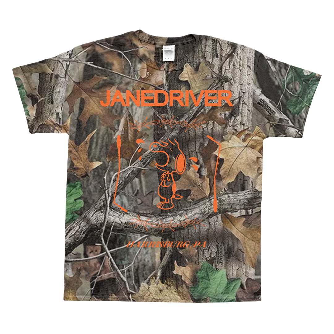 Janedriver hired me to design a shirt for their show with Whirr and Nothing. I illustrated the crying Snoopy in Procreate before importing it into Figma to create the layout. The black and white run immediately sold out, leading to a second print. The camo variant later went on to sell out as well.
